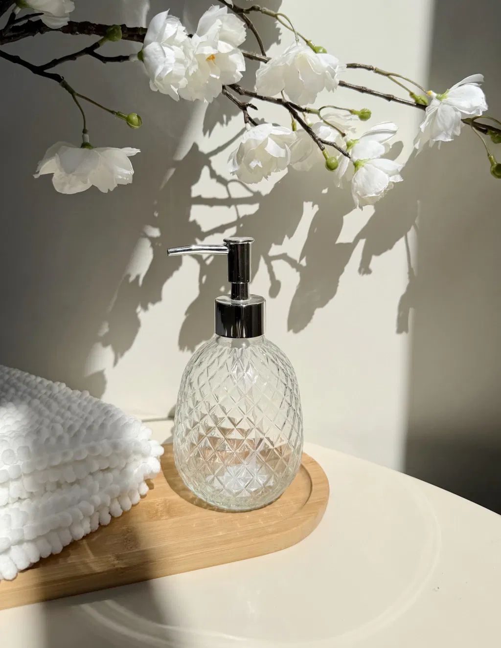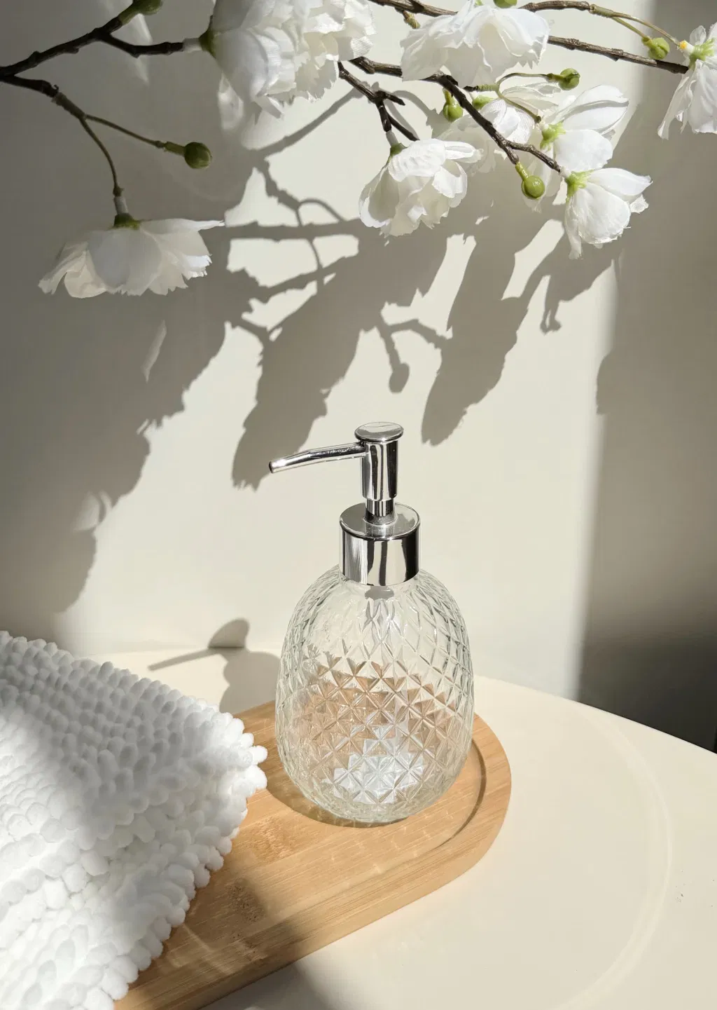 Dispenser de vidrio semi redondo con rombos pequeños tipo piña.