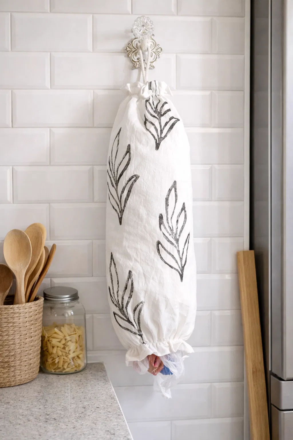 Guarda bolsas confeccionado en tusor con estampa artesanal. Tiene elasticos en ambos extremos y tirita para colgar.