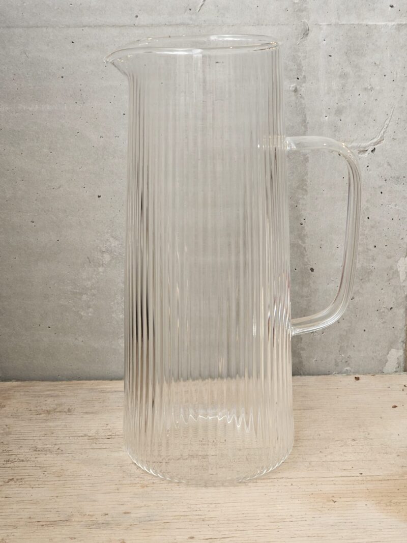 Jarra de vidrio rayada con asa de vidrio para mayor comodidad.