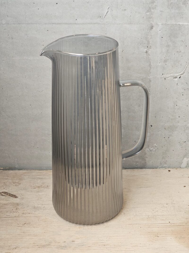 Jarra de vidrio rayada con asa de vidrio para mayor comodidad.
