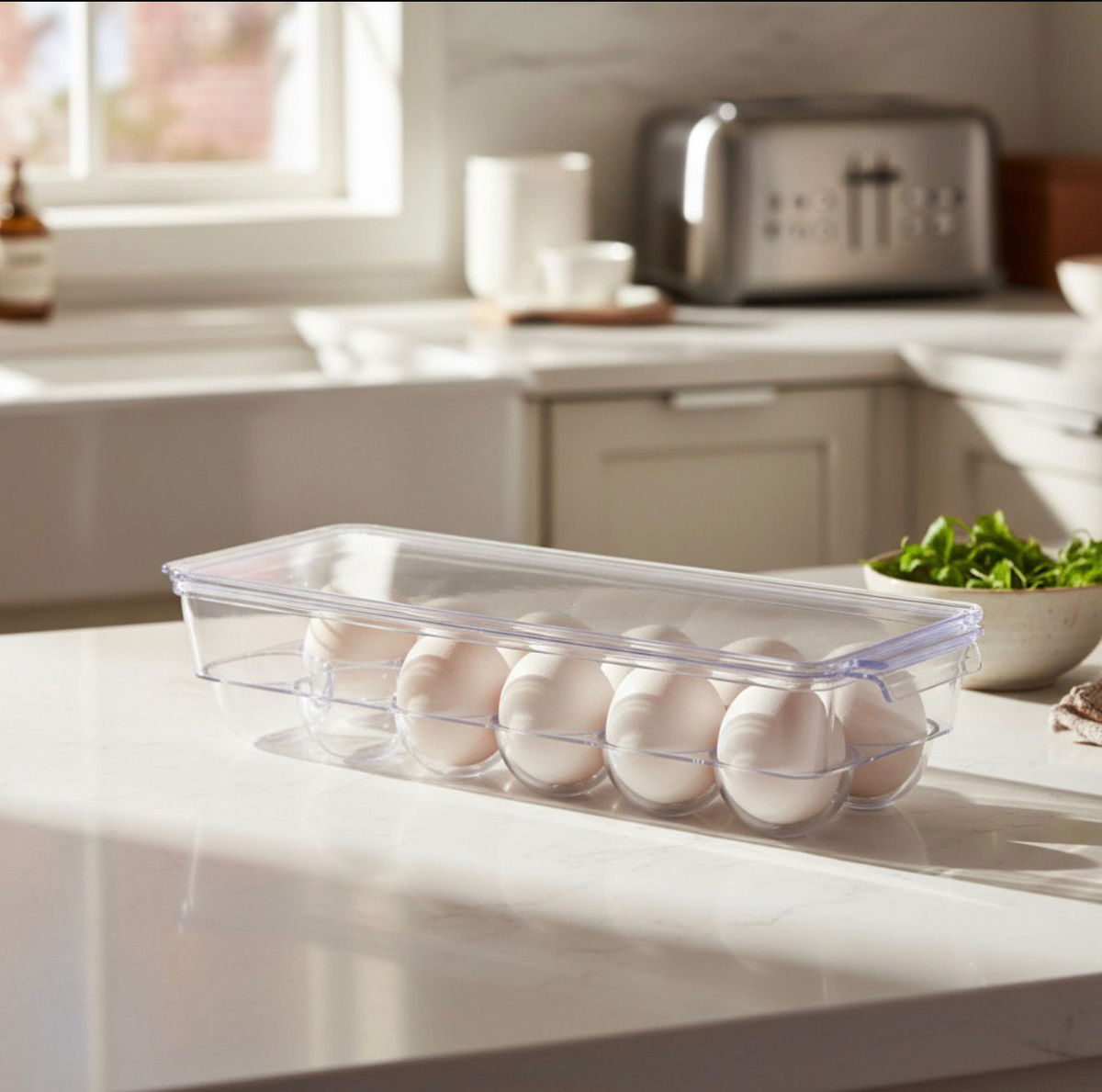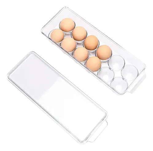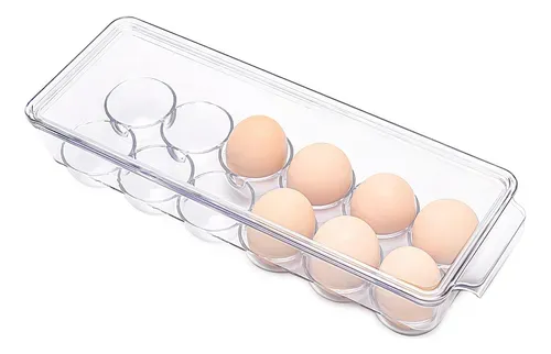 Huevera rectangular de acrilico transparente con tapa.