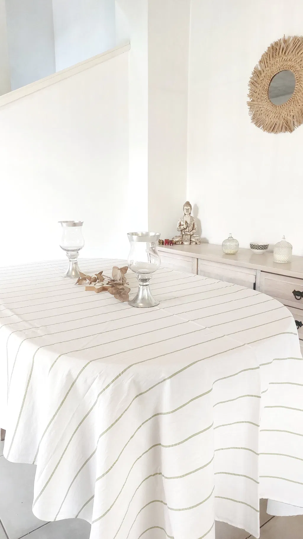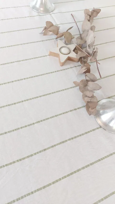 Mantel de tusor blanco con rayas verde oliva.