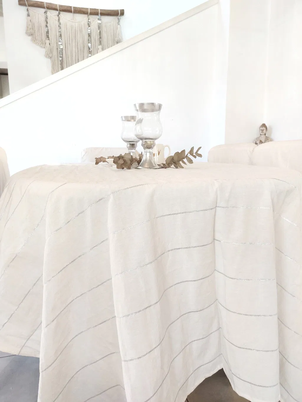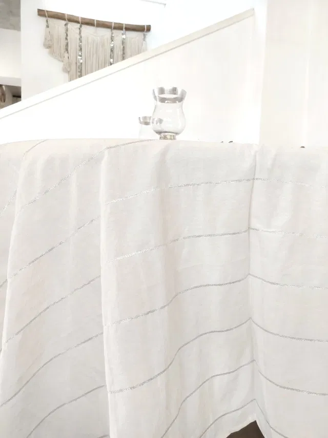 Mantel de tusor 100% algodon con rayas de lurex plateadas.