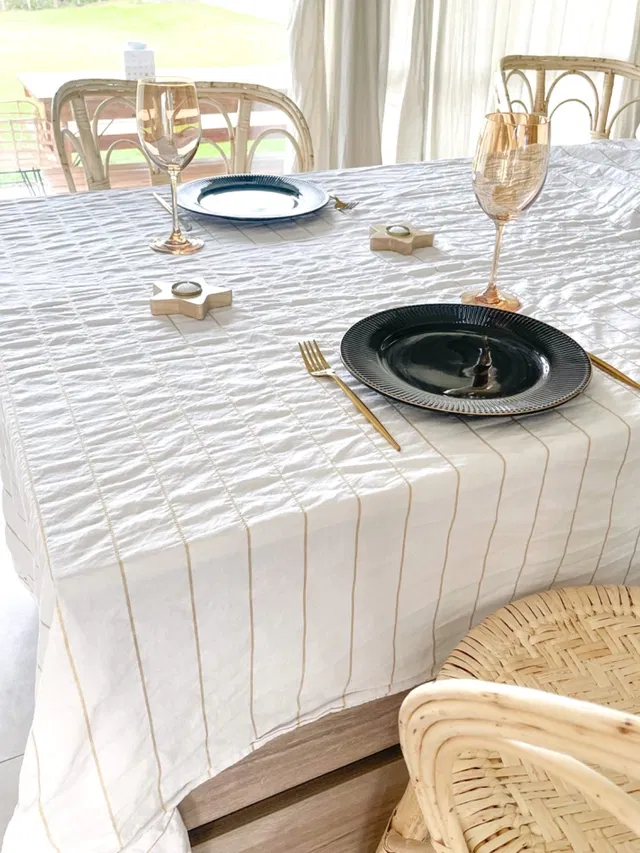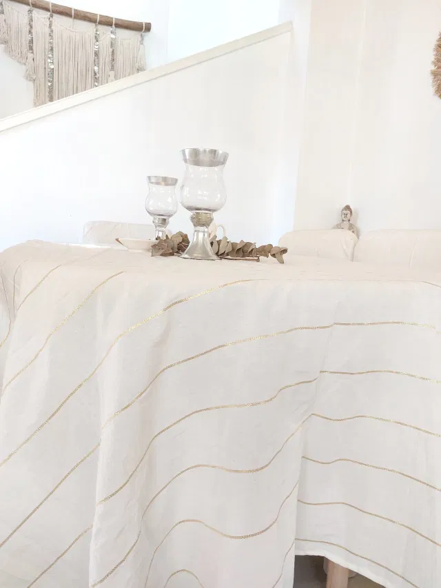 Mantel de tusor 100% algodon con rayas de lurex doradas.