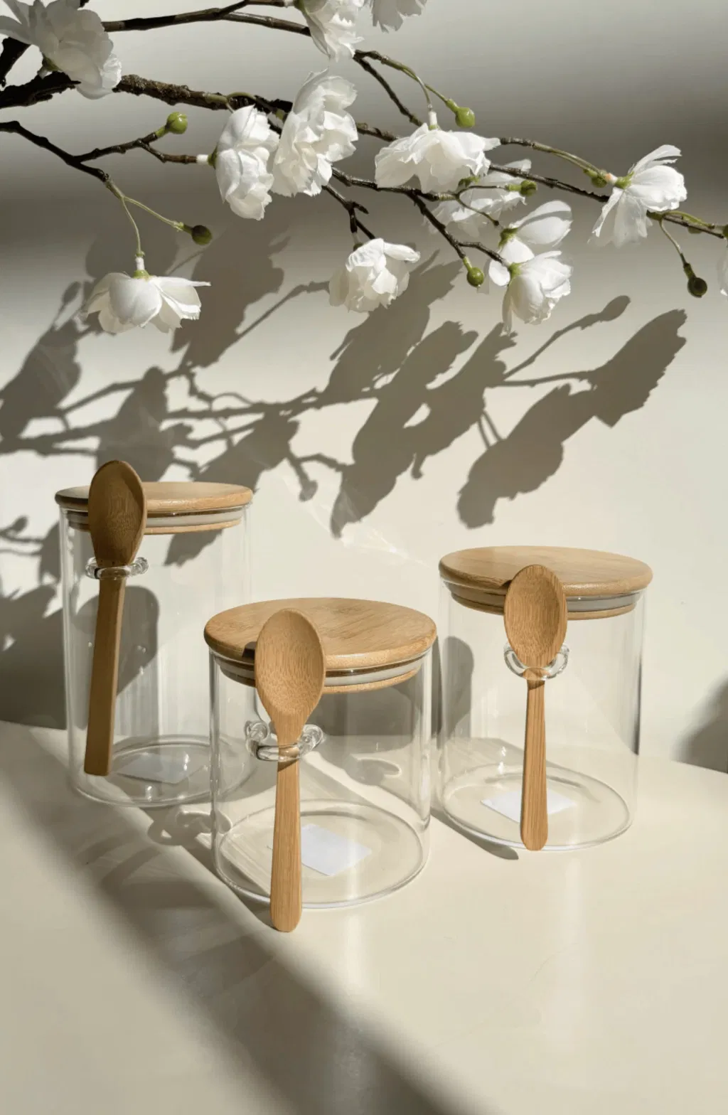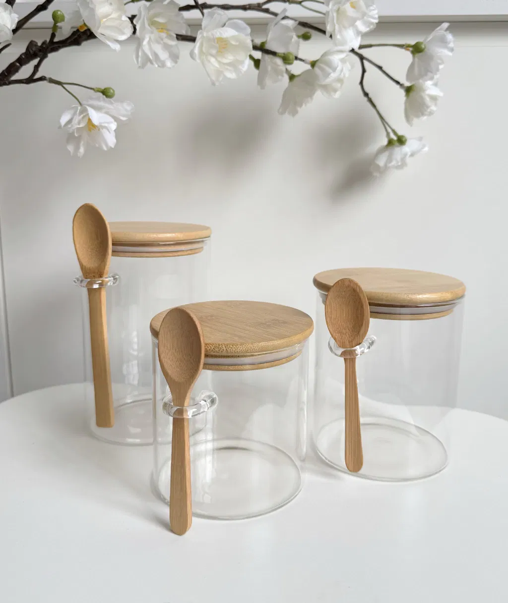 Set x3 frascos de vidrio resistente, incluye cierre hermético, tapa y cucharita de bambú.