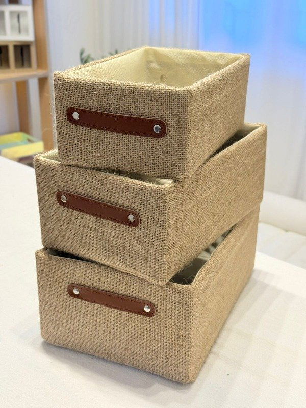 Set x3 Organizadores de yute rectangular con asas de cuero.