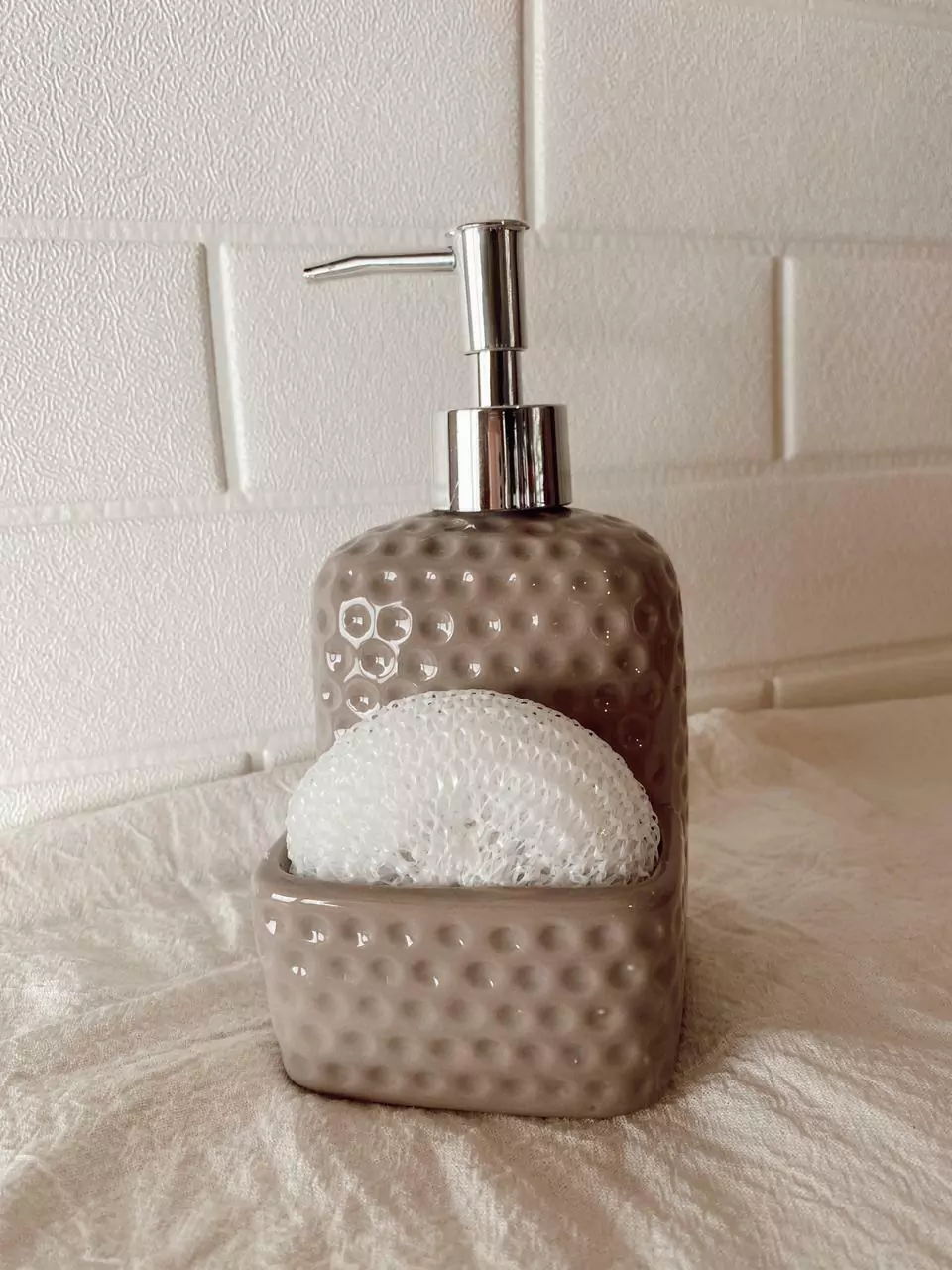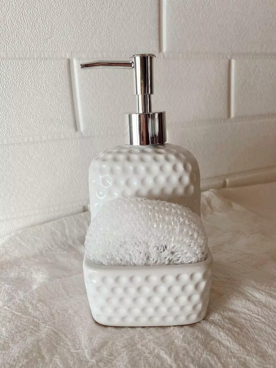 Dispenser para detergente de ceramica con porta esponja integrado.