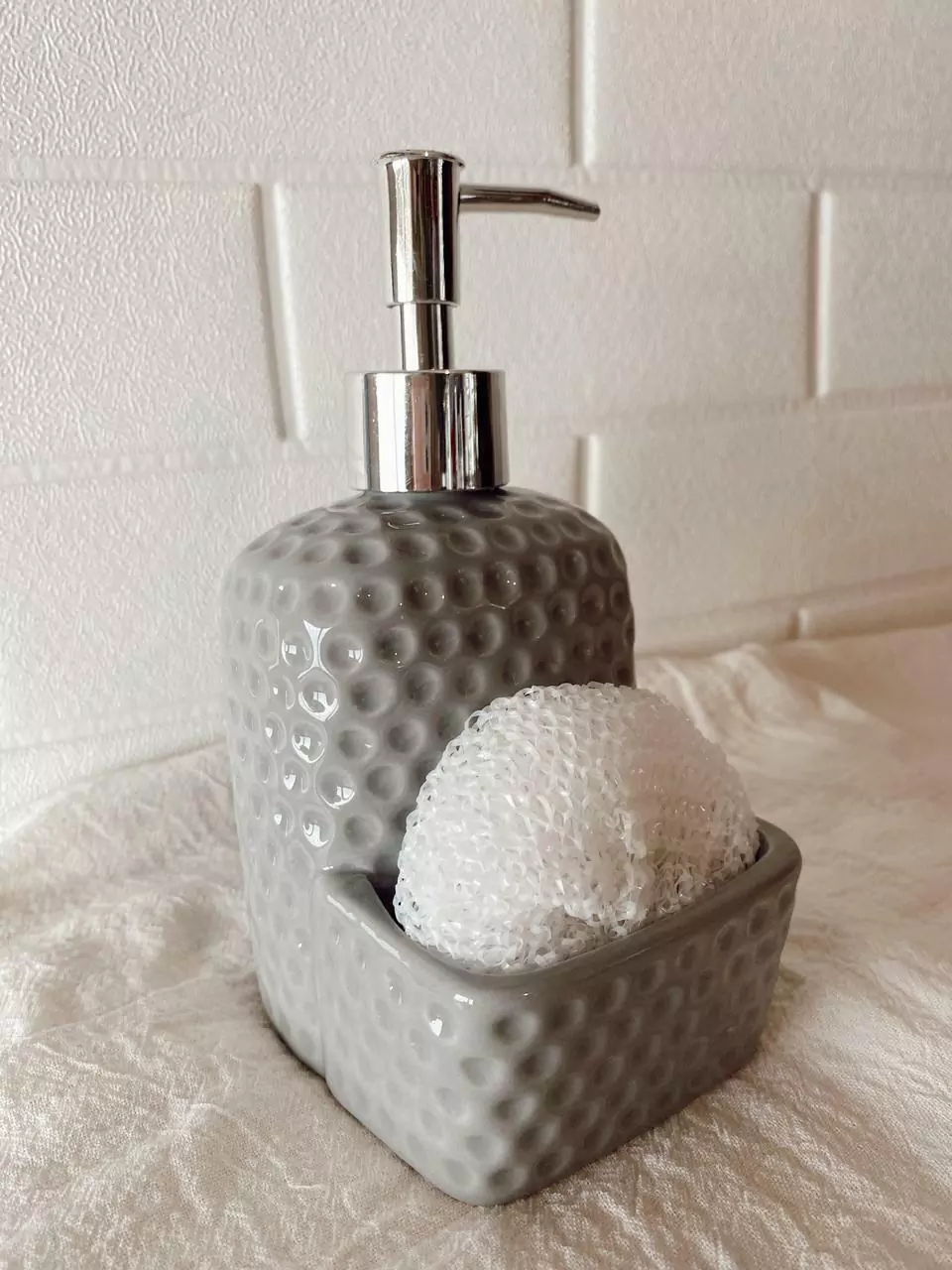 Dispenser para detergente de ceramica con porta esponja integrado.