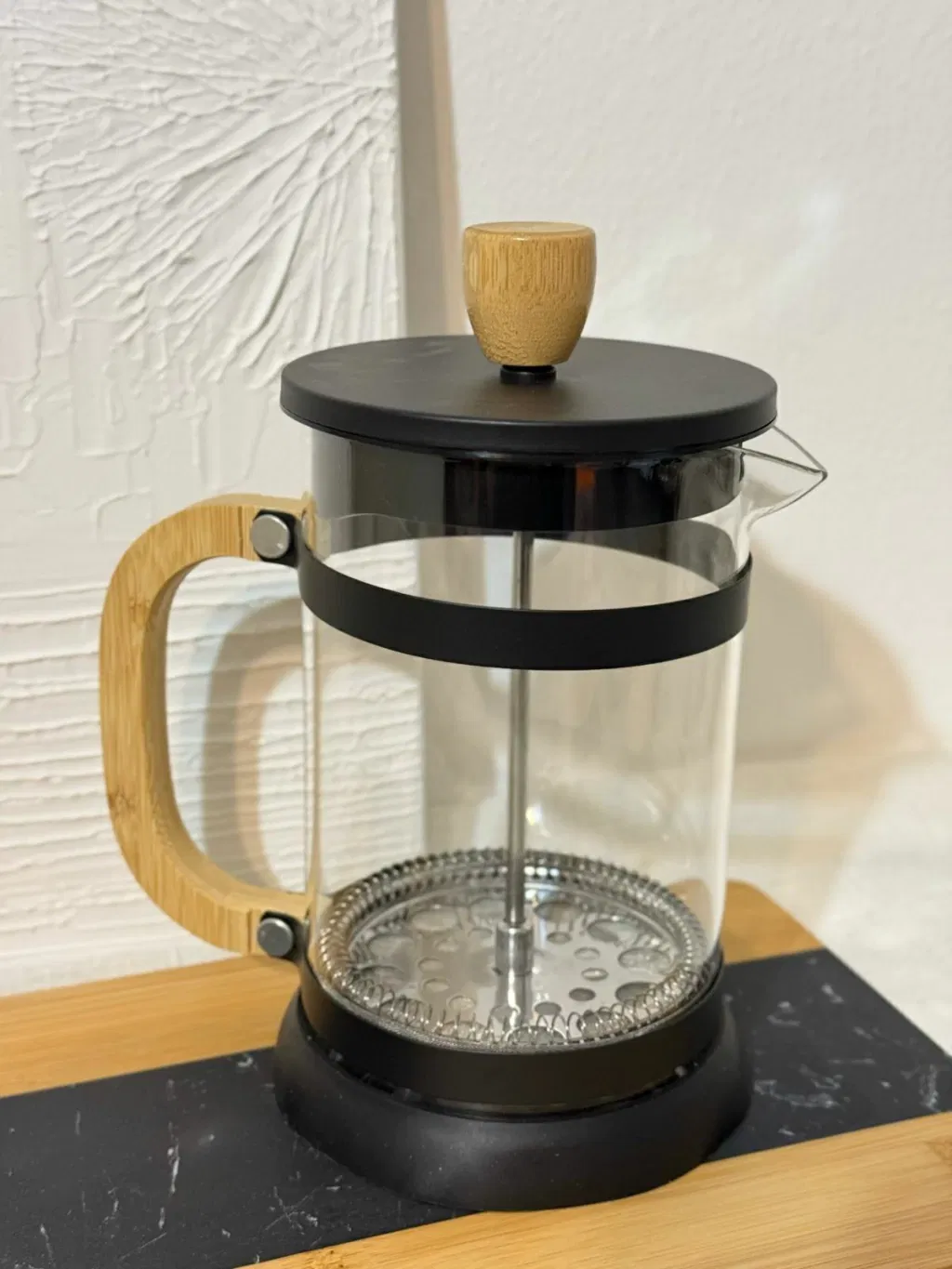 Cafetera de vidrio con estructura de acero color negro mate y detalles en madera bamboo.