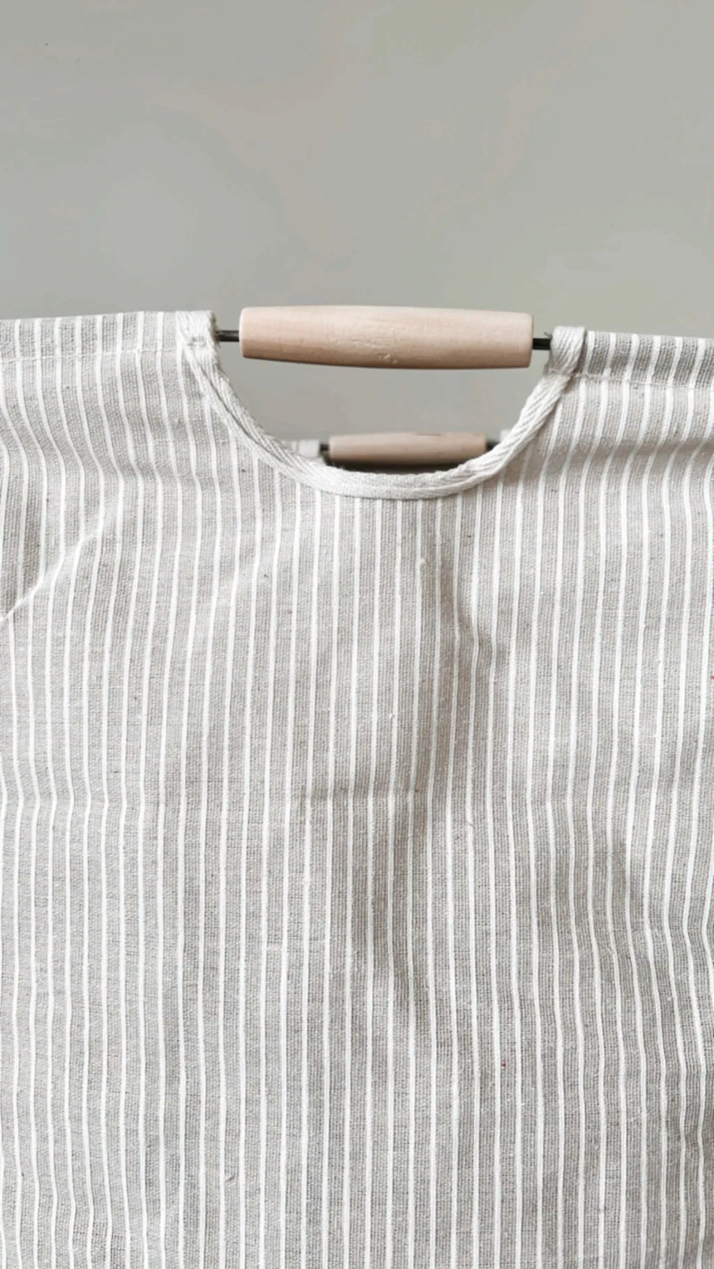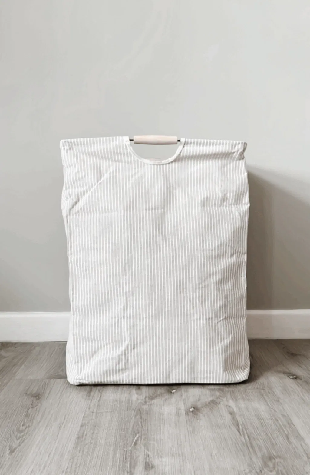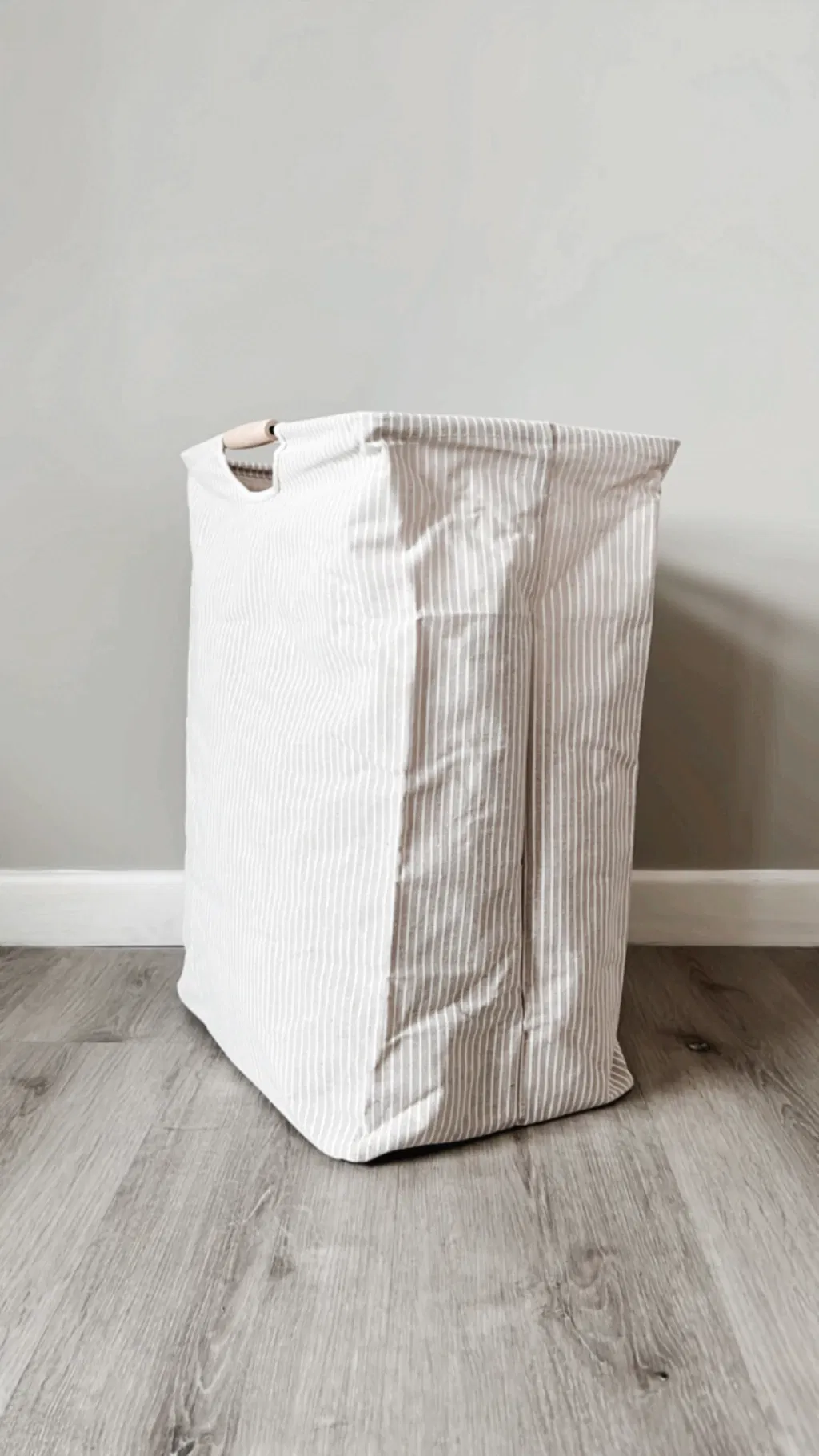 Cesto de ropa de tela impermeable color beige con rayas verticales color natural.