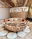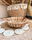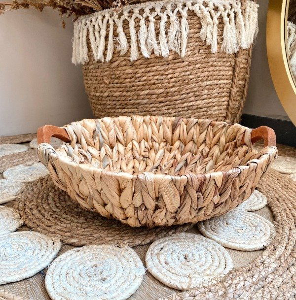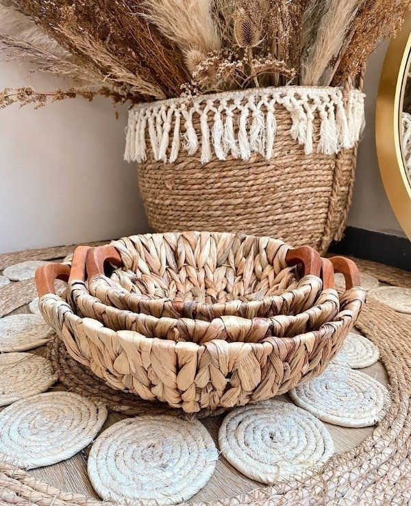 Bandejas redondas de jacinto trenzado con asas de madera.
