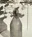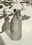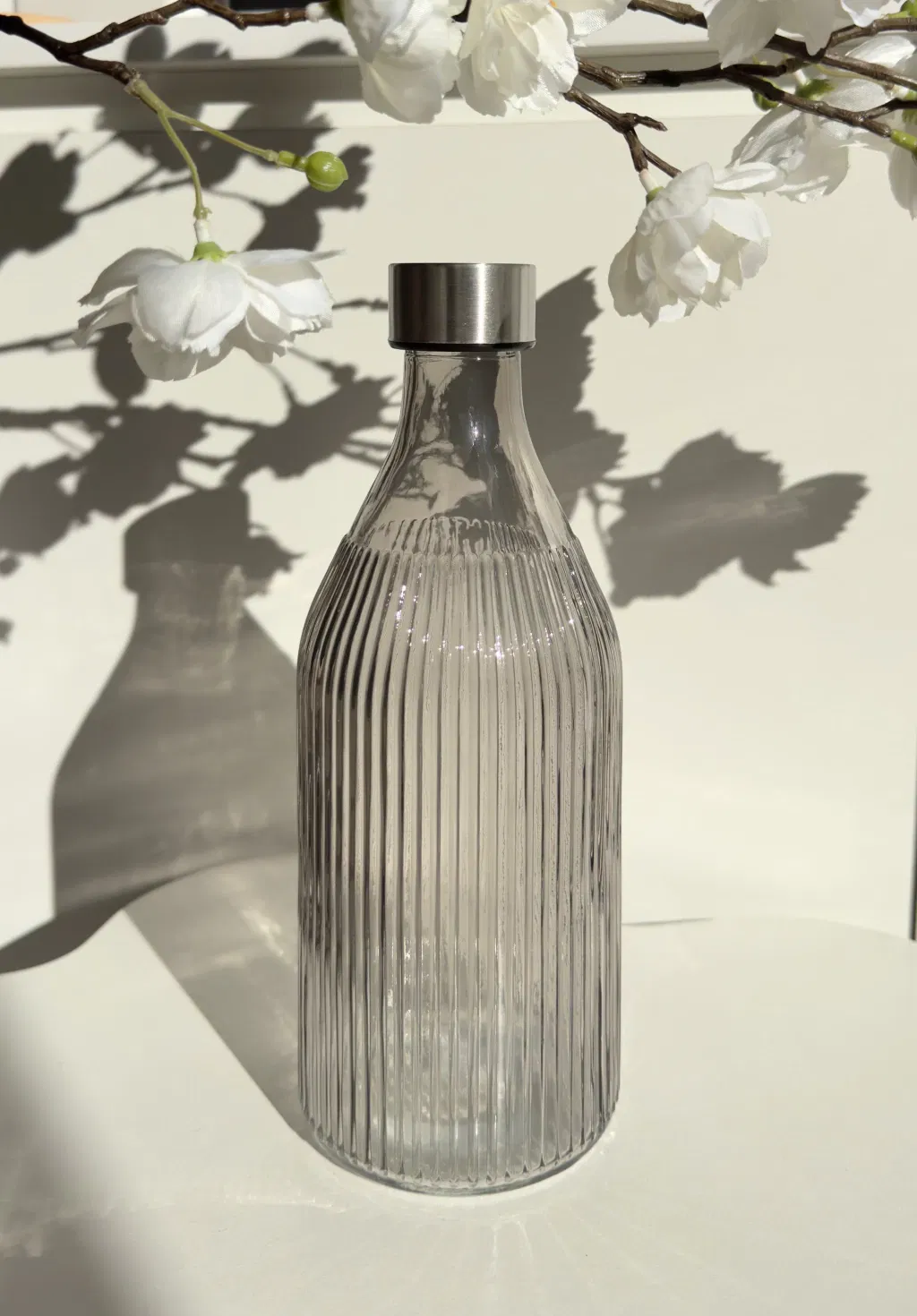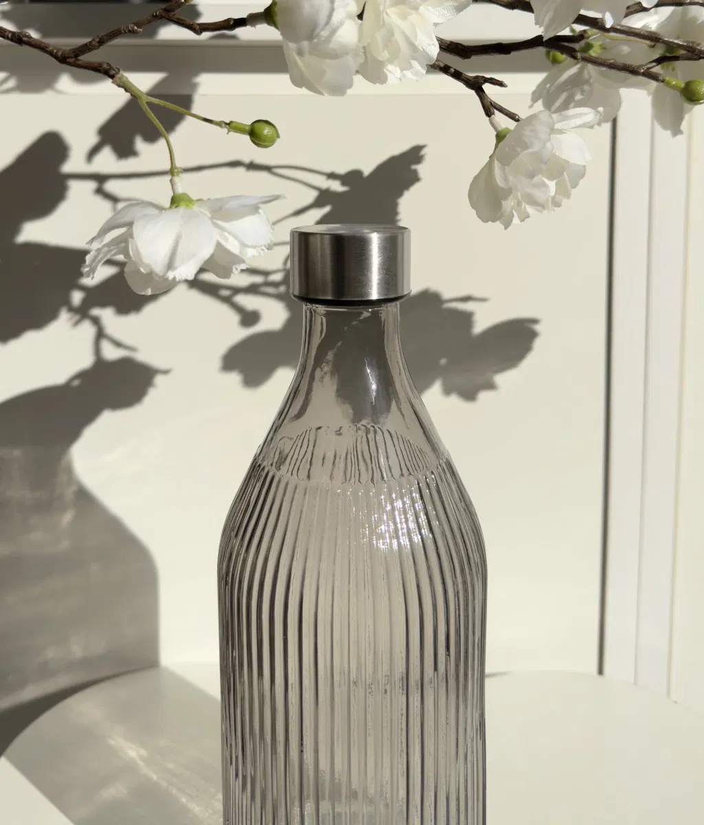 Botella redonda gris con rayas verticales.