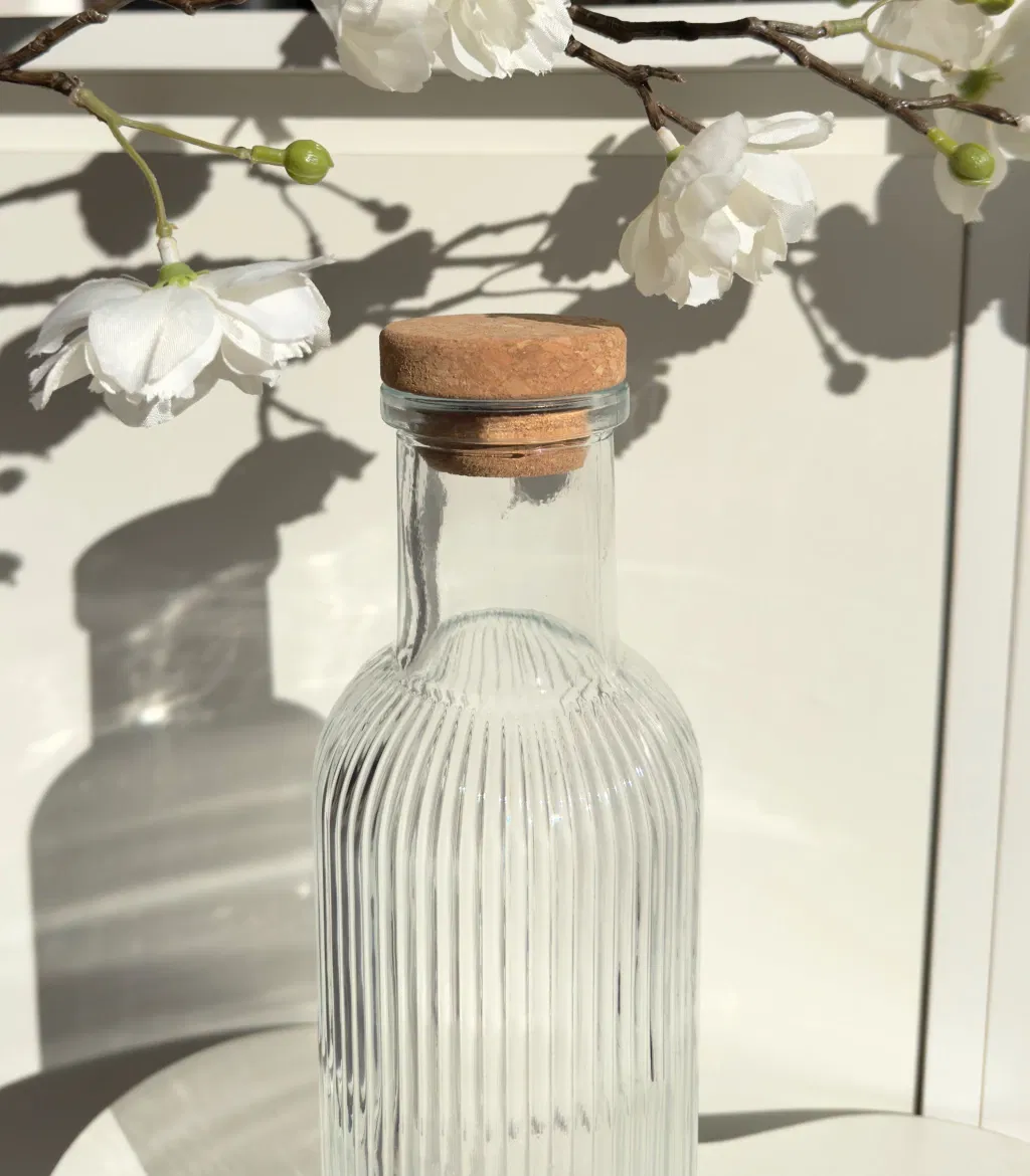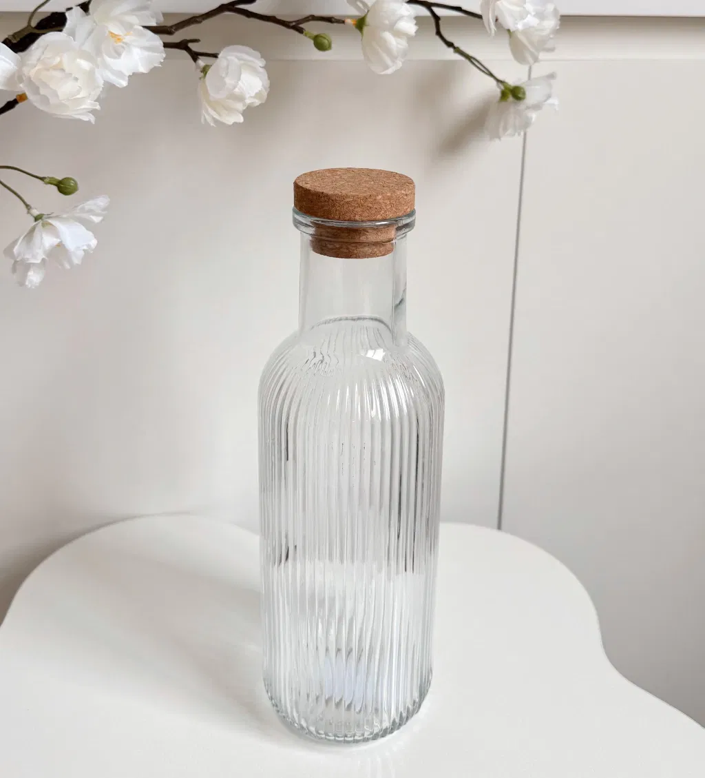Fabricada en vidrio resistente, posee un diseño moderno con rayas verticales y capacidad de 1lt, ideal para agua, jugos o bebidas favoritas.