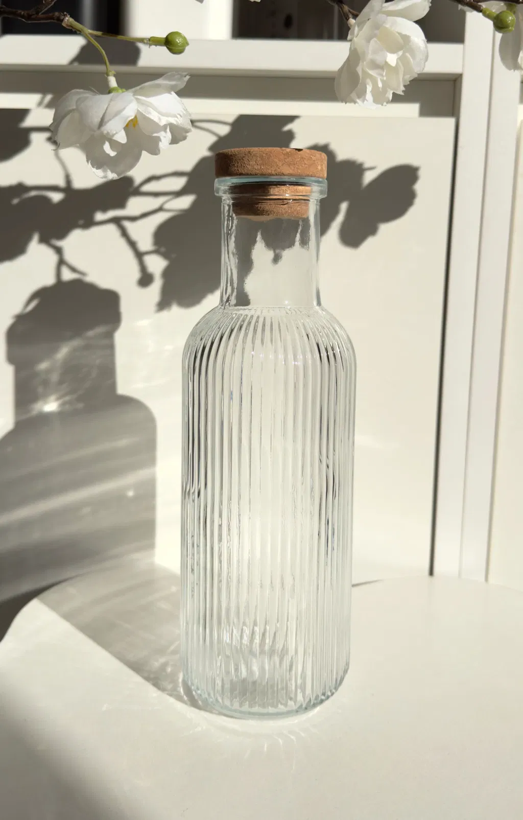 Fabricada en vidrio resistente, posee un diseño moderno con rayas verticales y capacidad de 1lt, ideal para agua, jugos o bebidas favoritas.