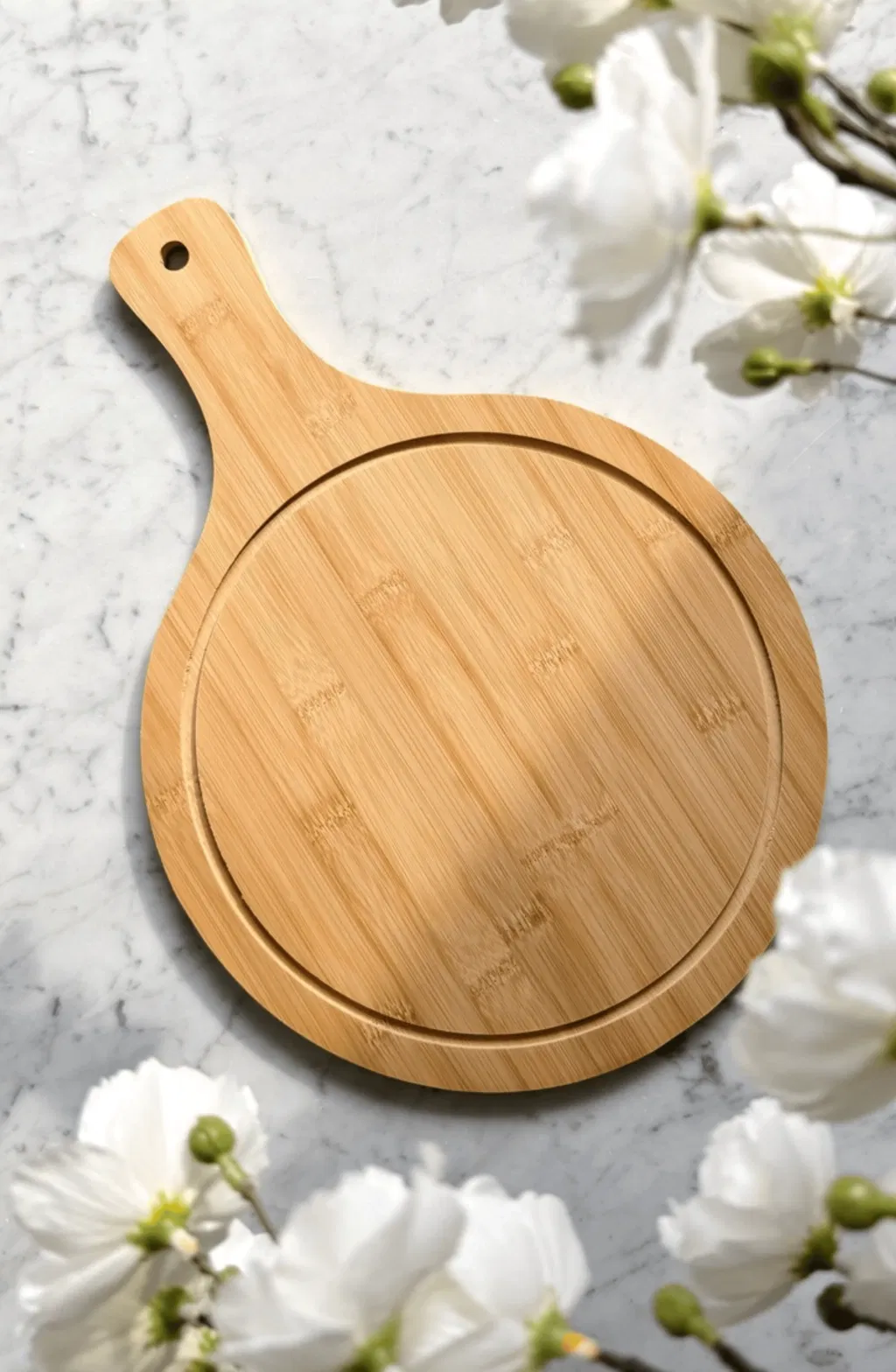 Tabla redonda con mango de bamboo, perfecta para servir quesos, fiambres o tus snacks preferidos.