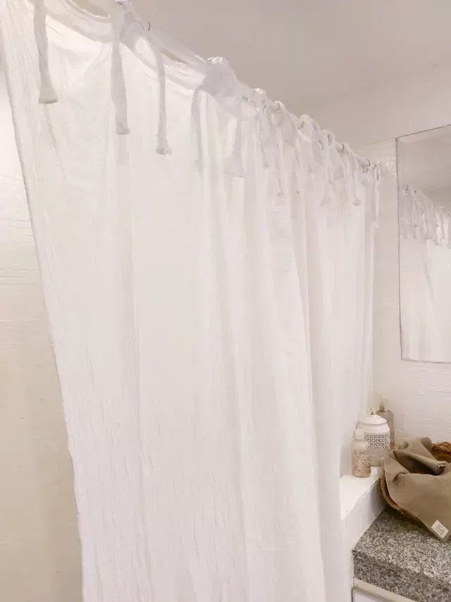 Cortina con lazos para atar, confeccionada en gasa arrugada de algodón.