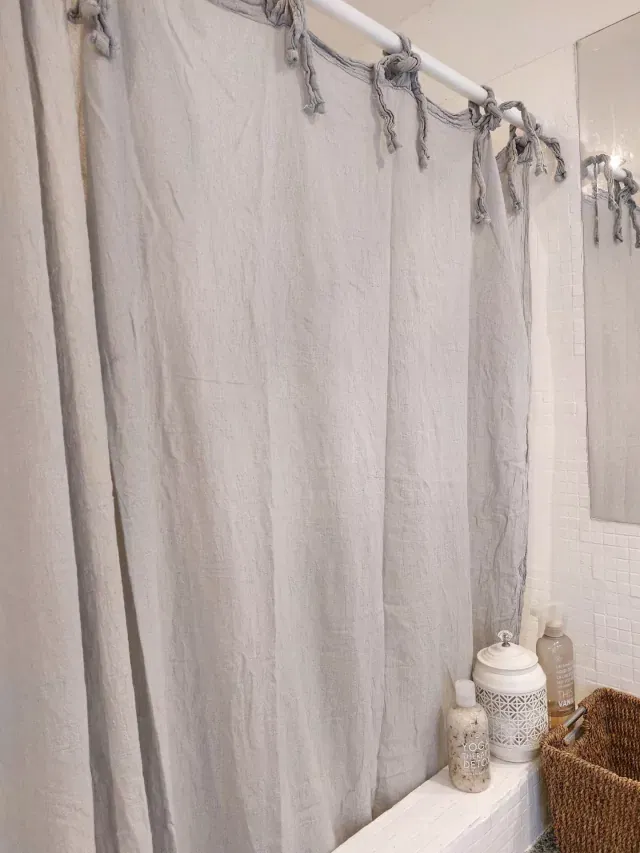 Cortina con lazos para atar, confeccionada en gasa arrugada de algodón.
