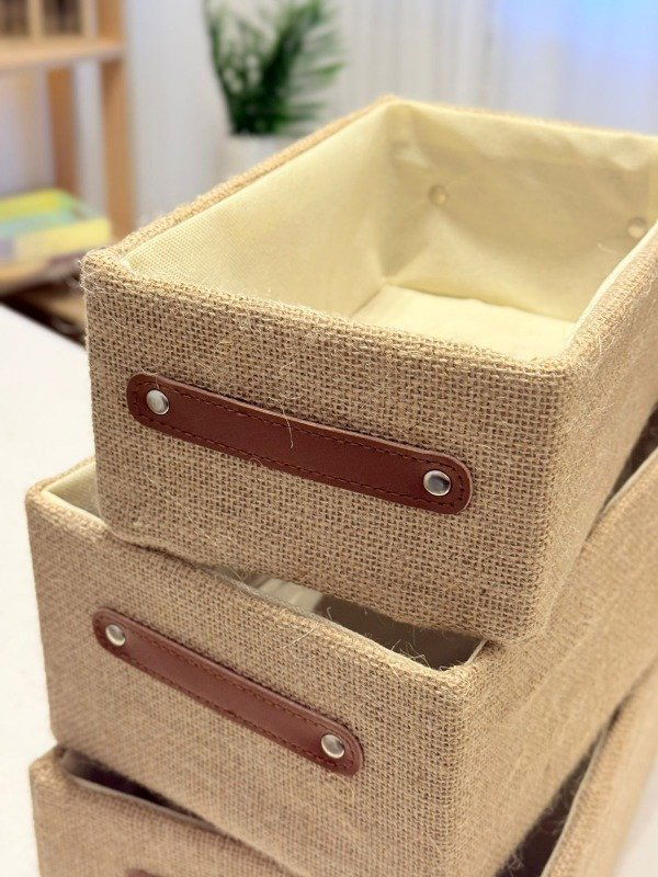 Set x3 Organizadores de yute rectangular con asas de cuero.